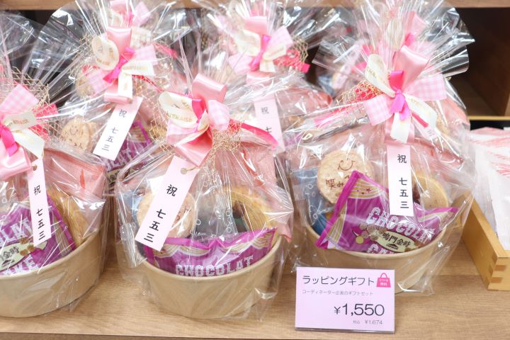 華やかで可愛らしいリボンで仕上げられた七五三オリジナルギフトにはお煎餅2種類・すこやかの樹バウムクーヘン・ビスキュイワッフル・笑みころん・ブッセ(イタリア栗)・ショコラケーキ(鳴門金時)を詰め合わせた、ボリューム満点の人気商品です。