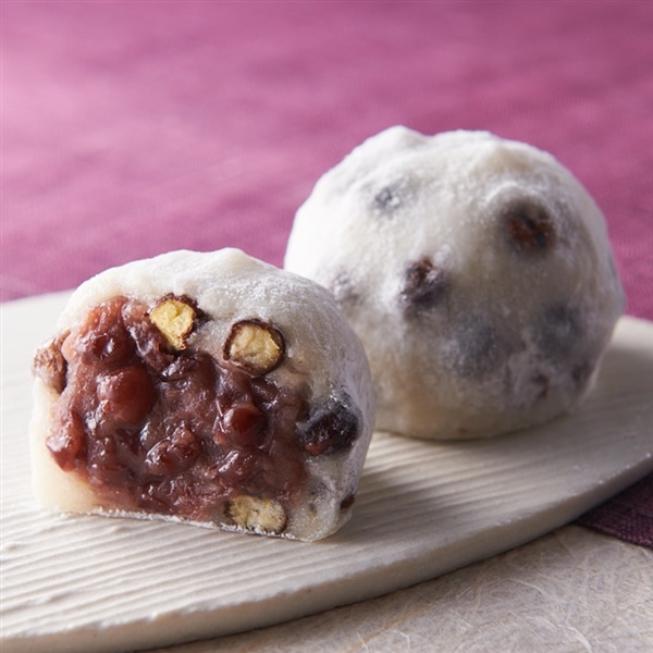 風味の良い北海道産赤エンドウ豆を練りこんだ生地で自家炊き粒餡を包んだ、こだわりの塩豆大福です。生地はコシがありながら伸びのある食感が特徴の宮城県産みやこがねを使用し、甘さを抑え、米本来の甘味や旨味を感じられる仕上がりになっております。