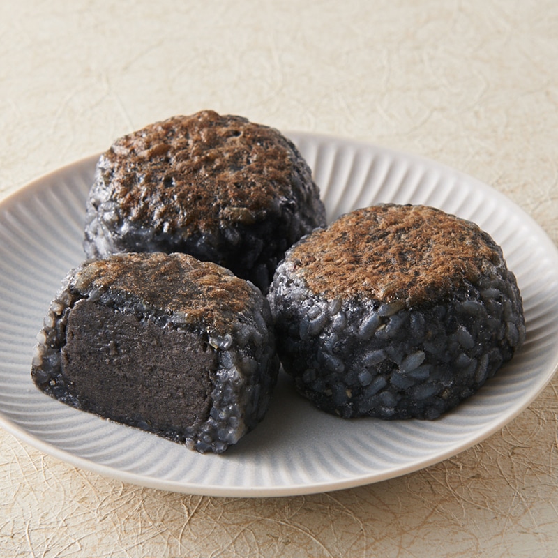 粒感残る国産米使用の生地で、いりごまを加え竹炭パウダーで色付けしました。胡麻餡を包み、天面を香ばしく焼き上げた焼き大福です。