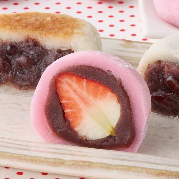 一粒苺をまるごと包んだ季節限定の苺大福です。国産もち粉を使用し、なめらかで柔らかい生地に仕上げました。生地はピンク色に色づけし、自家炊きこし餡と国産苺をまるごと包んでおります。白州名水で炊き上げたこだわりの餡を使用しています。