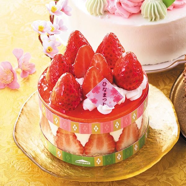 ふんだんに苺をトッピングした贅沢なケーキです。 ワンランク上のおいしさを追求した、ひなまつりのお祝いにぴったりなデコレーションです。 ふんわりとしたスポンジで、たっぷりの苺と甘酸っぱい苺果肉入り苺ソース、 キレのあるホイップクリームをサンドしました。 苺本来の甘酸っぱさと、ホイップクリームのリッチな味わいをお楽しみいただけます。