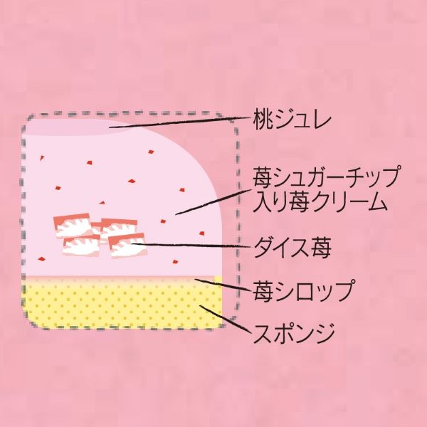 ふんわりと春の訪れをイメージしたクリーム(苺クリーム、りんご風味クリーム)を絞ったカラフルで可愛らしいケーキです。 つぶつぶ食感のある苺シュガーチップ入り苺クリームの中にダイス苺を包み、やさしい甘さの桃ジュレを重ね、苺をトッピングしました。