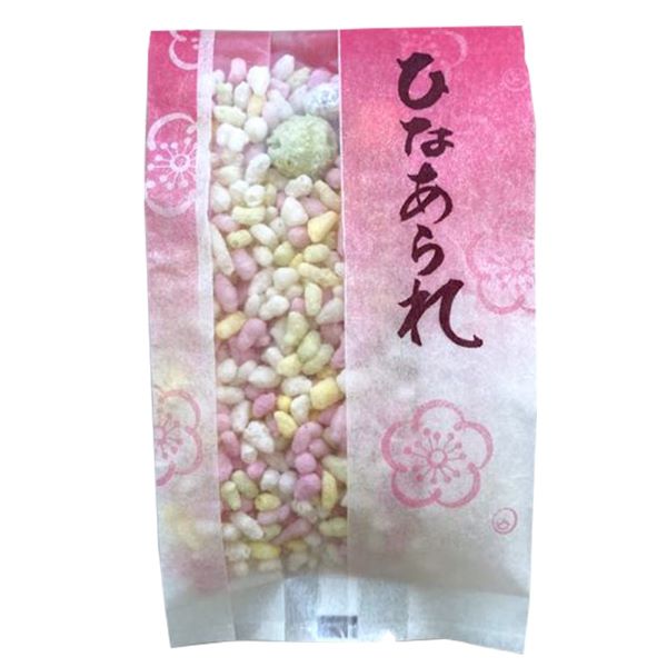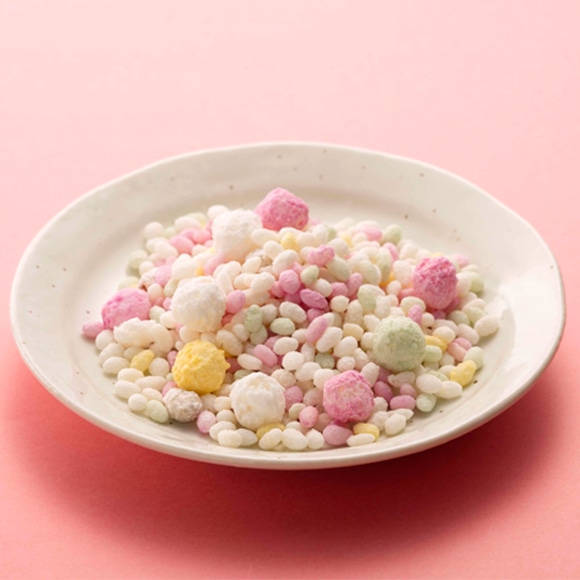 たわら型のあられ、少し大きめのふうせん、砂糖をかけた大豆を程よく混ぜ、色や食感に変化をもたらせたひなあられです。