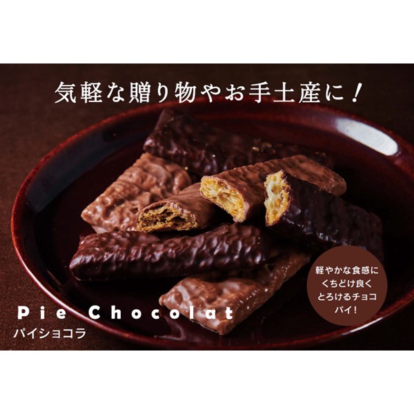 「ごま」にはブレンドした金ごまと白ごまを、「アーモンド」には発酵バターの風味に合う香ばしいアーモンドを、「コーヒー」には苦みと酸味の調和がとれた香り高い3種類のコーヒーを生地に練りこみ焼きあげ、それぞれのパイの風味にあうベルギー産クーベルチュールスイートチョコレートとミルクチョコレートで包みました。 サクッと軽やかな食感と、口溶けのよいチョコレートのハーモニーが絶妙な本格的なパイチョコ菓子です。