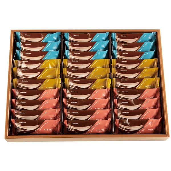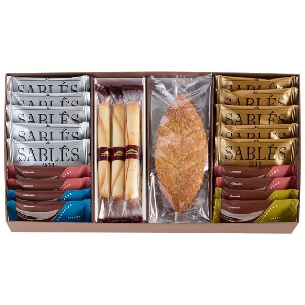 「サブレ・オ・ショコラ(ミルク・スイート)」「パイショコラ(アーモンド・コーヒー・ごま」「ラングドシャロール」「リーフパイ」を詰合せました。 口の中でホロホロと崩れるような食感のクッキー生地にナッツのアクセントと、口溶けのよいチョコレートをかけた「サブレ・オ・ショコラ」と、サクッと軽やかな食感のパイ生地と、口溶けのよいチョコレートのハーモニーが絶妙なパイチョコ菓子「パイショコラ」、コク深く芳醇なバターが口いっぱいに広がり、サクッとホロっとほどけるような、やさしい食感の「ラングドシャロール」、ヨーロッパ産発酵バターが香るパイのサクサクとした食感「リーフパイ」です。