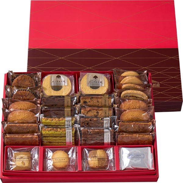 ドライフルーツやナッツの風味が豊かな『ケーク・オ・フリュイ』、 濃厚なショコラ生地を丁寧に焼き上げた『ショコラ・オランジュ』、 一層一層を丁寧に焼き上げた『ノーテンクーヘン』、 バター風味際立つ『ガトーバスク』、 2種類のごまの香ばしさ、ココアシュガーが甘く香るパイ『フリューゲルパイ セサミ』、 アーモンドスライスをふんだんに使用したサクサク食感の『フロランタン』、 シンプルでくちどけの良い『バターサブレ』、 焦がしバター、挽きたてのアーモンドプードルをたっぷりと使用した生地をこんがりと焼き上げた『ヴィジタンティーヌ』(18個入、40個入)、 しっとりとした食感の『バウムクーヘン』(18個入、40個入)、 素材の美味しさをぎゅっと閉じ込めバラエティ豊かな味が楽しめる『クッキー』(40個入)の詰合せです。 世界各地から厳選された素材を卓越した技術で焼き上げた至極の一品の焼き菓子の詰合せです。