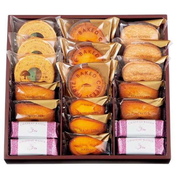 クリームチーズを使用した「ベイクドチーズタルト」、風味豊かな「バウムクーヘン」、バターのうまみがじっくりと味わえる「マドレーヌ」、 しっとりとした食感の「フィナンシェ」、サックリとした食感の「ダックワーズコーヒー」、 芳醇な香り広がる自家製レーズンをクリームにたっぷりと混ぜ込みクッキーにサンドした「シャトー・レザン」が入った焼き菓子の詰合せです。
