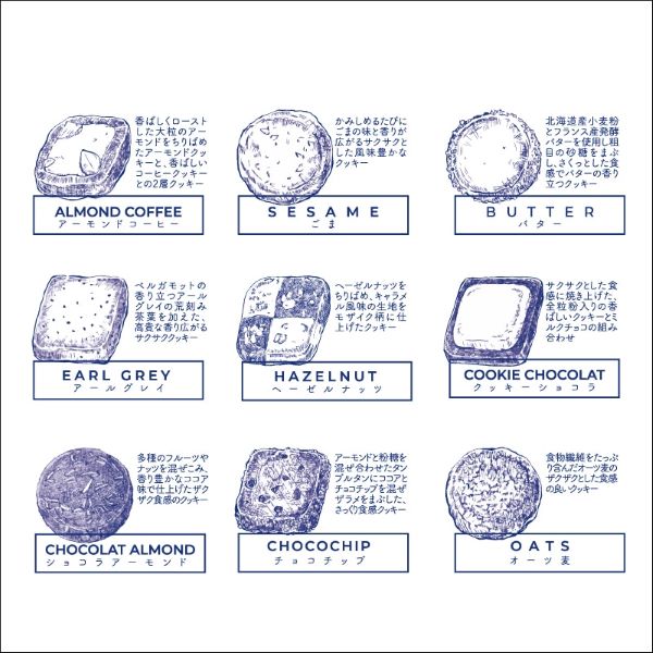 バターやうみたて卵、アーモンドの加工方法へのこだわり、ナッツ類や特徴的な素材を使用した、9種の様々な食感と風味のクッキーに仕上げました。見た目も楽しい、バラエティ豊かな9種の味を、食べやすい大きさに仕上げ、個包装にし詰合せました。ショコラアーモンドクッキーを加え、デザインも一新し、発売いたします。 バターの濃厚なおいしさと、素材の引き出す香りや風味・食感がそれぞれに特徴のあるクッキーです。