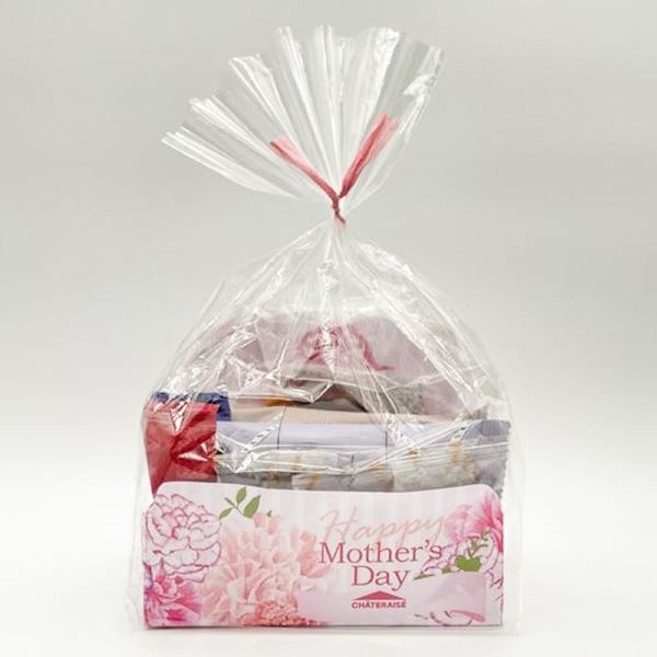 母の日デザインの箱に人気の焼き菓子とチョコレートを詰合せてラッピングしました。 (焼き菓子:チョコラスク・ホワイトチョコラスク・ビスキュイワッフルスイート、チョコレート:チョコレートクランチ(アーモンド・レーズン)・プティショコラ(クッキーミルク・アーモンドミルク・ストロベリーミルク))